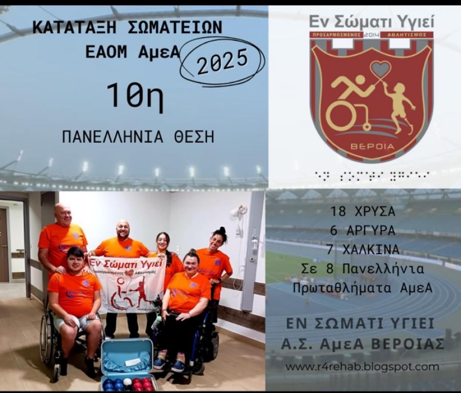 Αναρτήθηκαν από την Εθνική Αθλητική Ομοσπονδία Ατόμων με Αναπηρίες, οι πίνακες με την κατάταξη των αθλητικών σωματείων για το 2025. Η κατάταξη γίνεται βάσει του αριθμό των μεταλλίων που αποκτήθηκαν σε όλα τα πανελλήνια πρωταθλήματα του έτους, τόσο με τον αριθμό των χρυσών μεταλλίων όσο και με τον απόλυτο αριθμό. Το "Εν Σώματι Υγιεί" Α.Σ. ΑμεΑ Βέροιας, βρίσκεται στην 10η θέση με βάση των αριθμών των χρυσών (18) και στην 12η θέση βάσει του απόλυτου αριθμού μεταλλίων (31).
