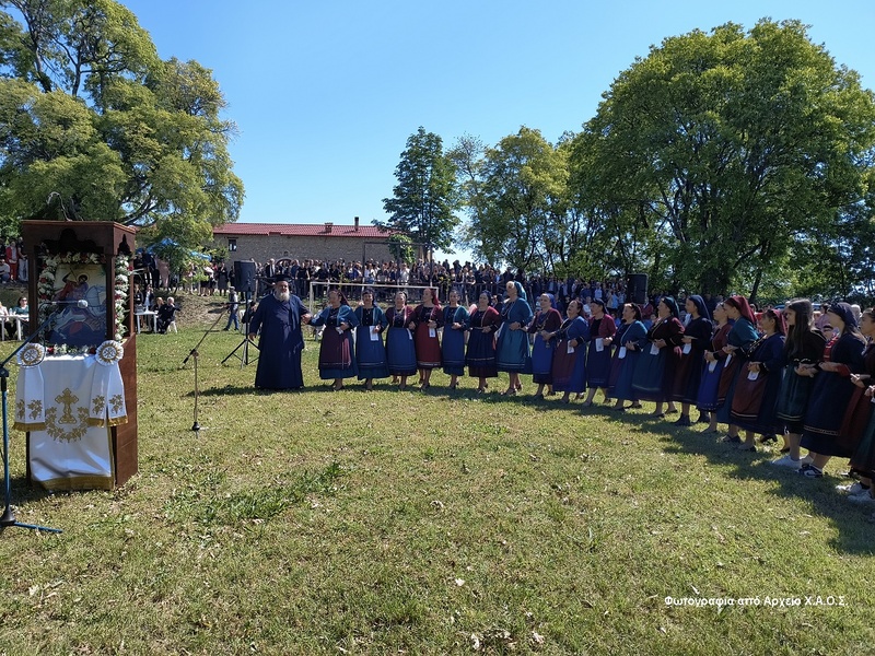 Μετά την θεία λειτουργία στην εκκλησία της Ιεράς Μονής, η εικόνα του Αη Γιώργη μεταφέρεται στην αυλή του μοναστηριού και ξεκινά ο χορός με το τραγούδι «Μπρος στ’ Άγιου Γιώργη την αυλή, ιδώ βαρούν τα σήμαντρα να μαζιφτούμι σήμιρα» και συνεχίζεται με άλλα τοπικά τραγούδια που περιγράφουν την δύσκολη καθημερινότητα των κατοίκων από τα δεινά που υπέφεραν από τους Οθωμανούς κατακτητές, αλλά και τραγούδια της χαράς της άνοιξης και της Πασχαλιάς.