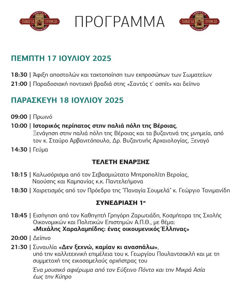 Το πρόγραμμα του 27ου Συναπαντήματος Νεολαίας Ποντιακών Σωματείων, το οποίο θα πραγματοποιηθεί από τις 17 έως τις 20 Ιουλίου 2025 στην «Παναγία Σουμελά», είναι και φέτος πλούσιο και ενδιαφέρον. Φέτος το Συναπάντημα είναι αφιερωμένο στην μνήμη του αείμνηστου πολιτικού και συγγραφέα, του ποντιακής καταγωγής Μιχάλη Χαραλαμπίδη.
