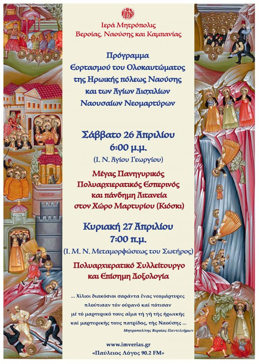 Το Σάββατο 26 Απριλίου, στις 6:00 μ.μ., στον Ιερό Ναό του Αγίου Γεωργίου Ναούσης θα τελεστεί Μέγας Πανηγυρικός Πολυαρχιερατικός Εσπερινός. Ακολούθως, θα πραγματοποιηθεί πάνδημη Λιτανεία προς τον Χώρο Μαρτυρίου (Κιόσκι), εκεί όπου οι πρόγονοί μας σφράγισαν με αίμα την πίστη και την ελευθερία.