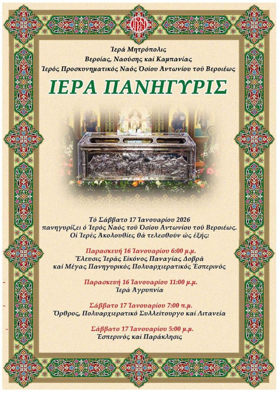 Φέρεται εἰς γνῶσιν τῶν εὐσεβῶν Χριστιανῶν ὅτι τό Σάββατο 17 Ἰανουαρίου 2026, τιμᾶται πανηγυρικῶς ἡ ἱερά μνήμη τοῦ Προστάτου καί Πολιούχου τῆς πόλεως τῆς Βεροίας, Ὁσίου Ἀντωνίου τοῦ Νέου, εἰς τόν ἐπ᾽ ὀνόματί του Ἱερόν Προσκυνηματικόν Ναόν, ὅπου καί πρόκειται νά πραγματοποιηθοῦν λατρευτικαί ἐκδηλώσεις συμφώνως πρός τό πρόγραμμα τῆς ἑορτῆς.