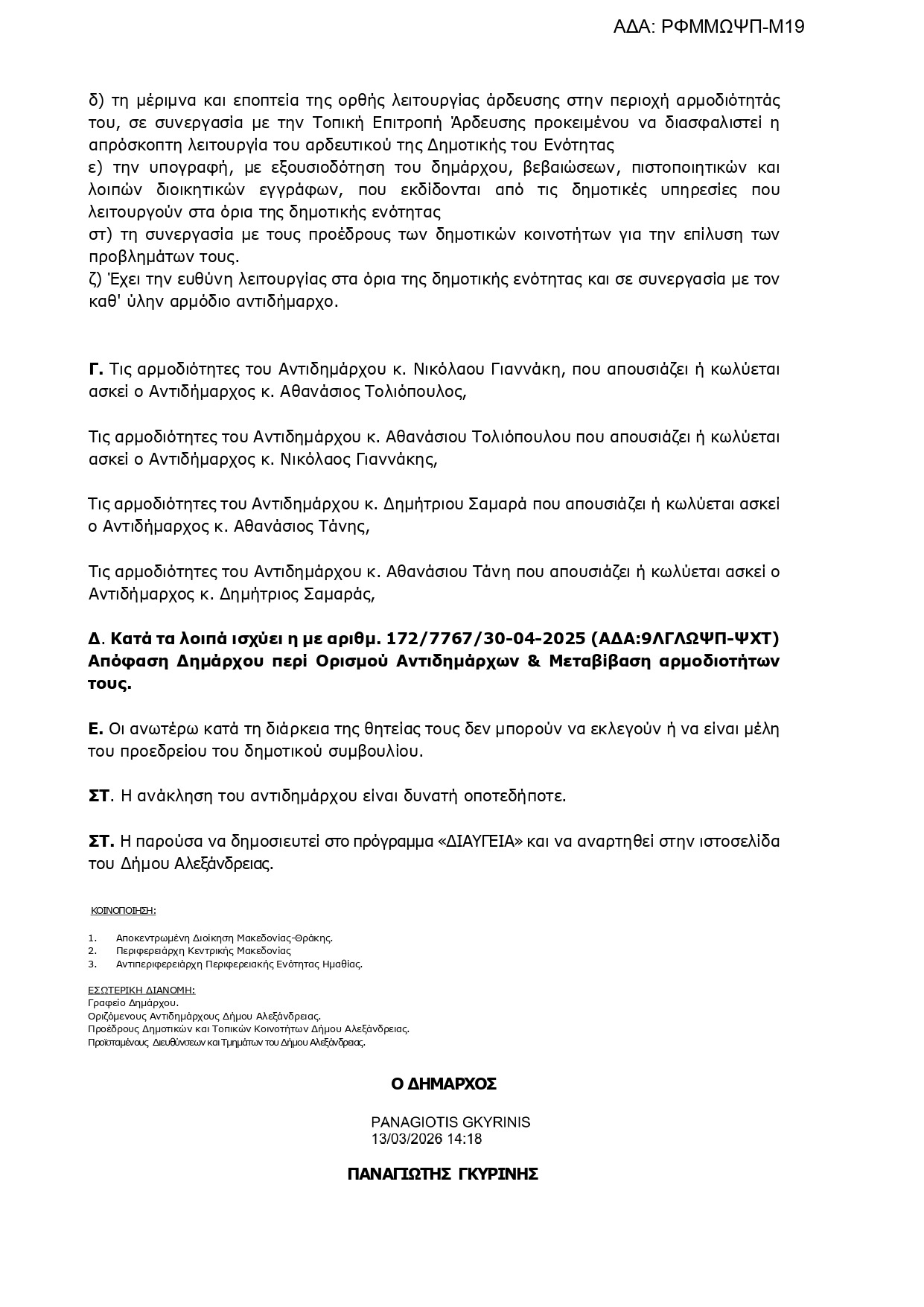 Ανακοινώνεται από το Γραφείο Δημάρχου του Δήμου Αλεξάνδρειας ότι με σημερινή απόφαση του Δημάρχου Παναγιώτη Γκυρίνη, με αρ. πρωτ. 4126/118/13-03-2026, ορίζονται οι νέοι Αντιδήμαρχοι του Δήμου Αλεξάνδρειας, με θητεία από 16 Μαρτίου 2026 μέχρι 15 Μαρτίου 2027.