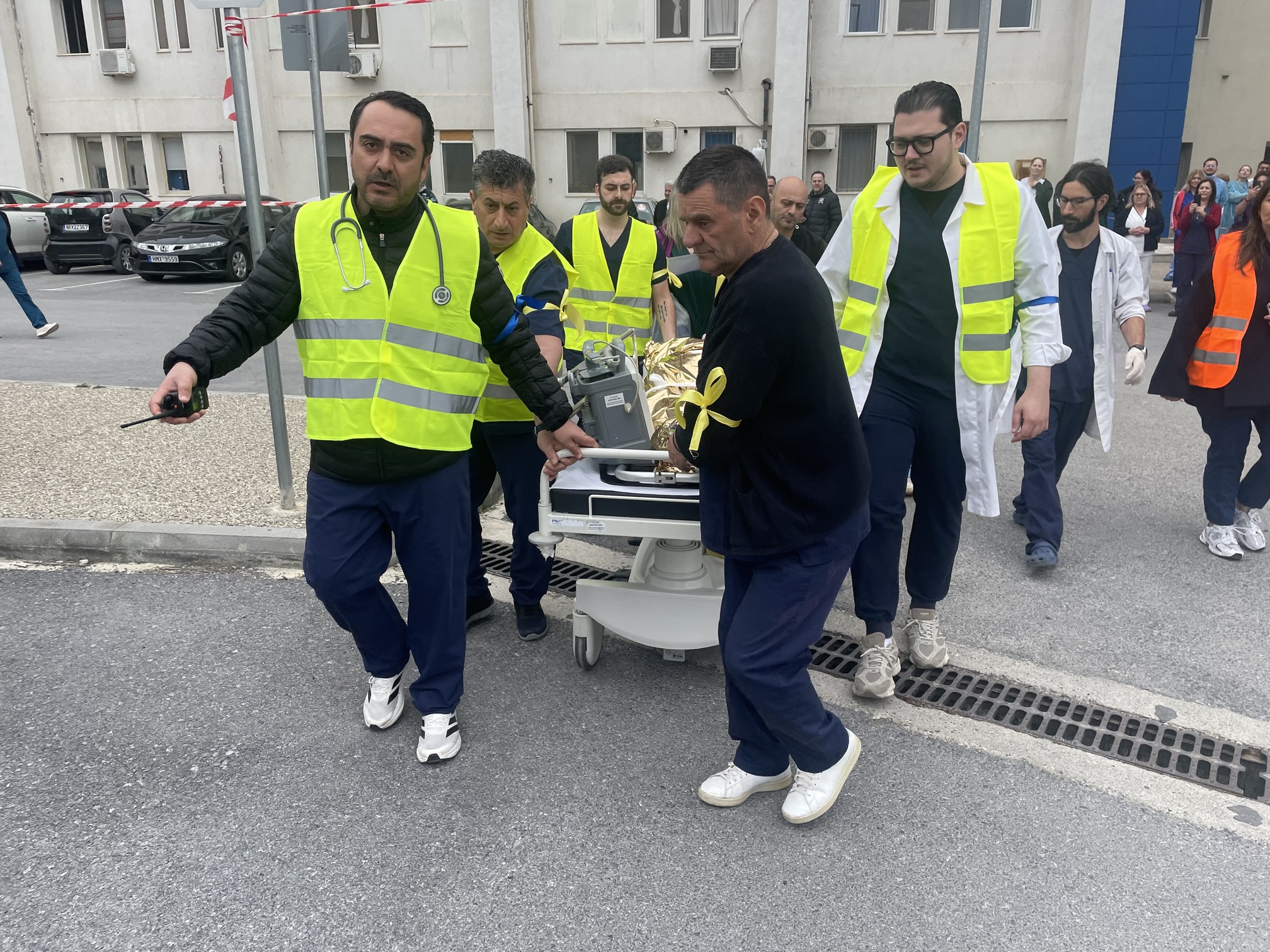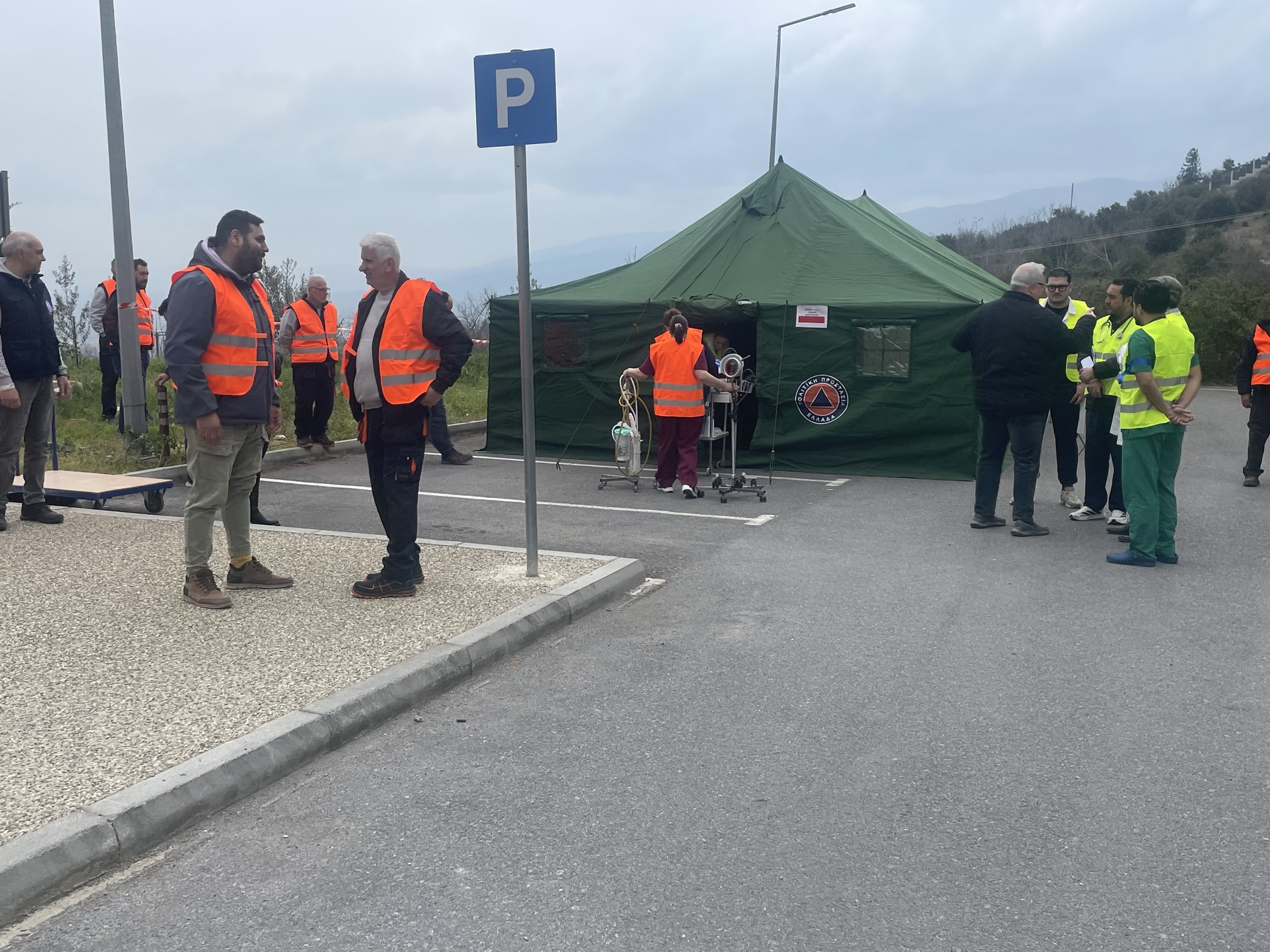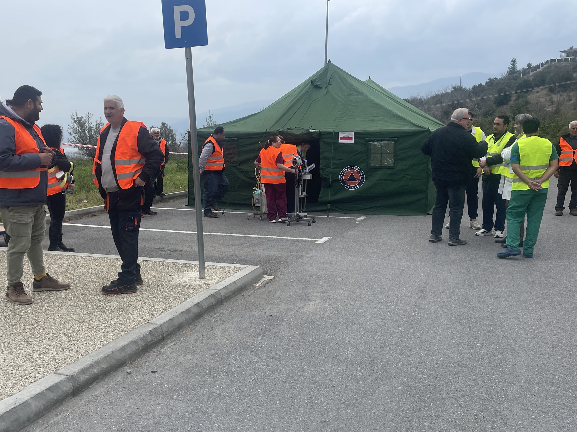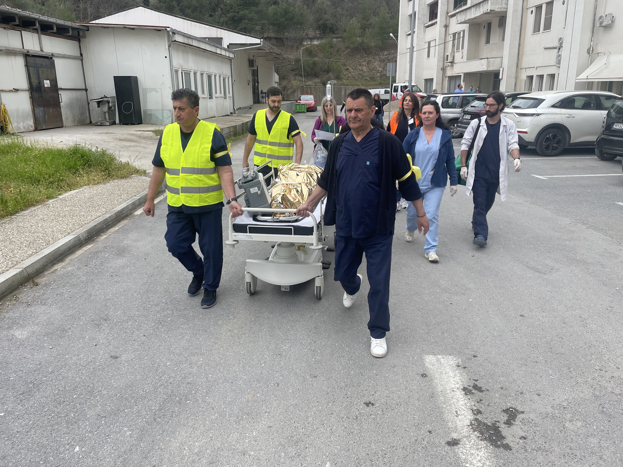 Παράλληλα, στον προαύλιο χώρο του νοσοκομείου αναπτύχθηκε προσωρινός σκηνικός καταυλισμός με μονάδες διαλογής (triage) και νοσηλείας, σύμφωνα με τα διεθνή πρότυπα διαχείρισης μαζικών καταστροφών. Εκεί πραγματοποιήθηκε η υποδοχή και κατηγοριοποίηση των περιστατικών με βάση τη βαρύτητά τους.