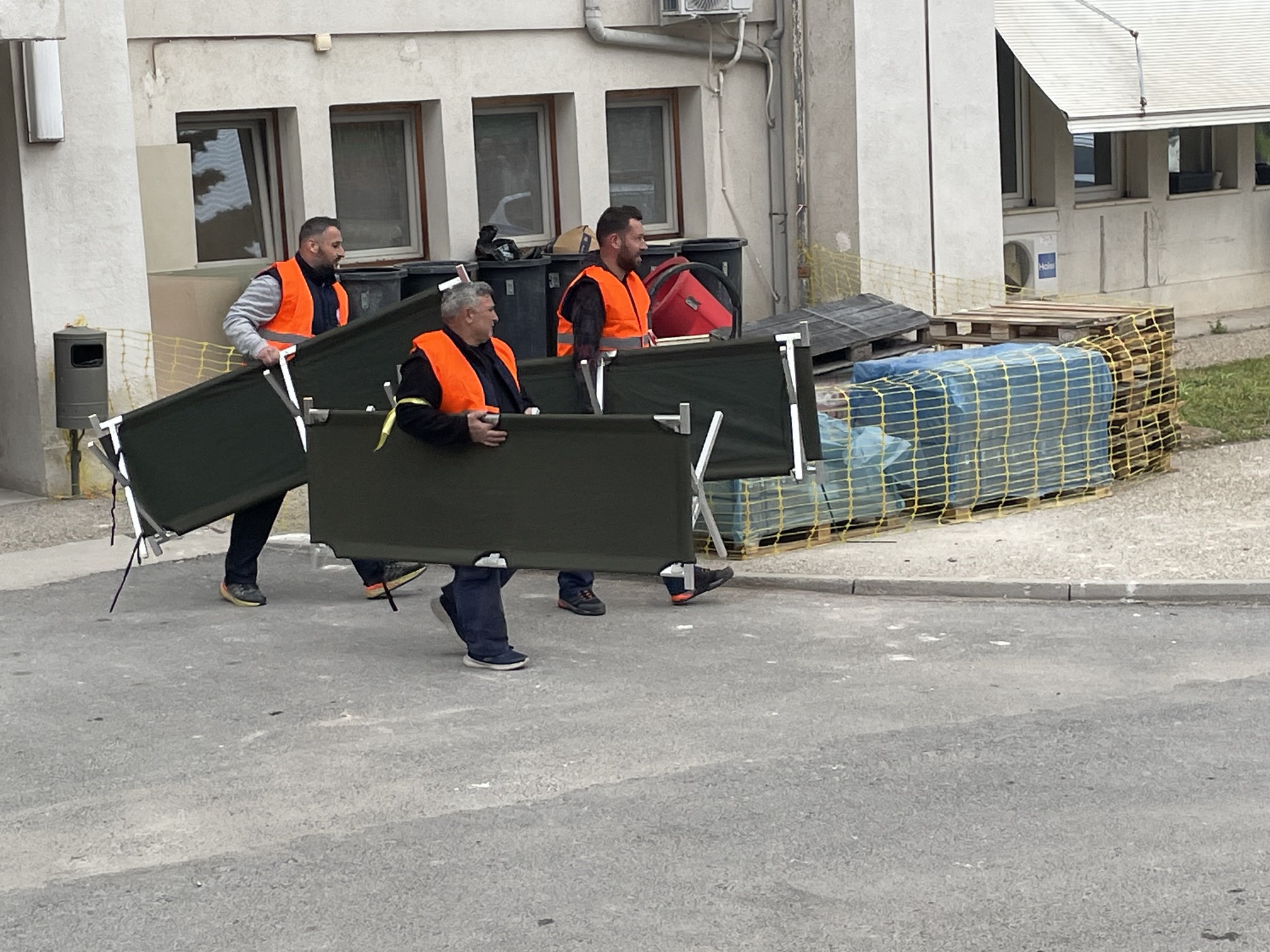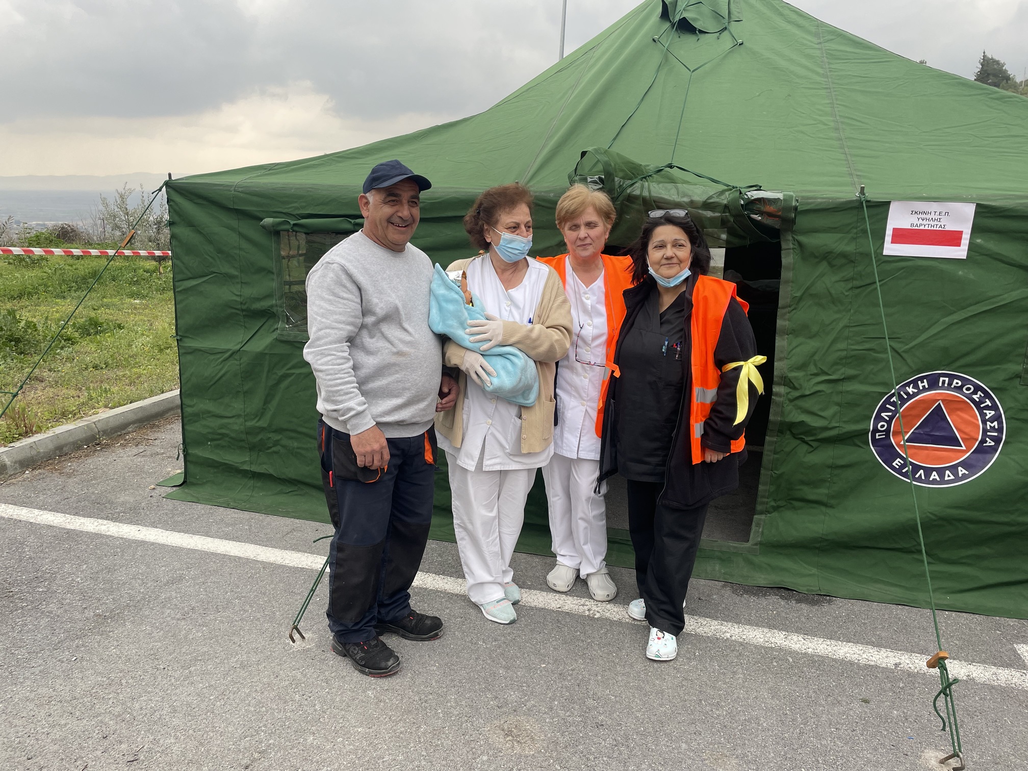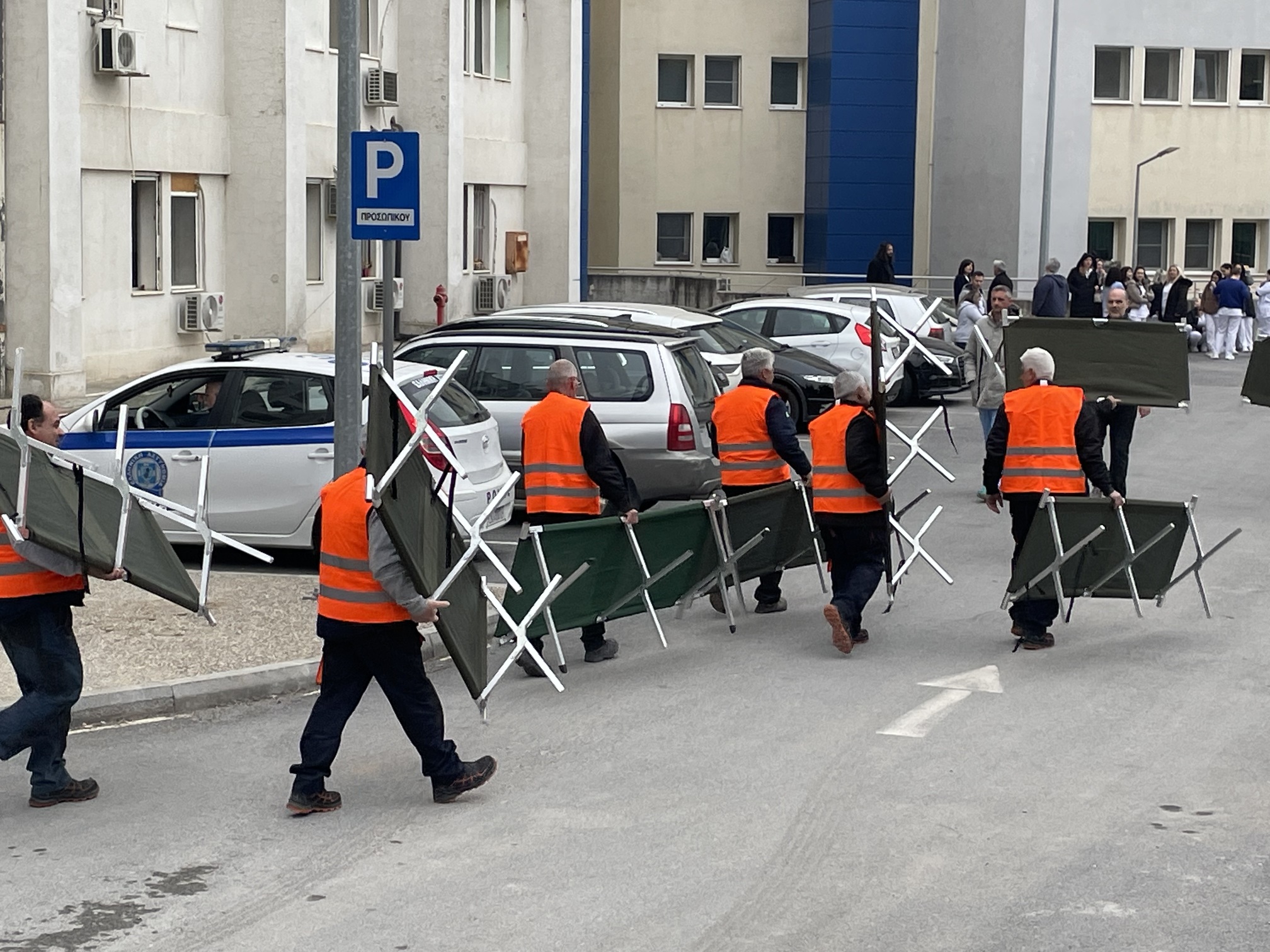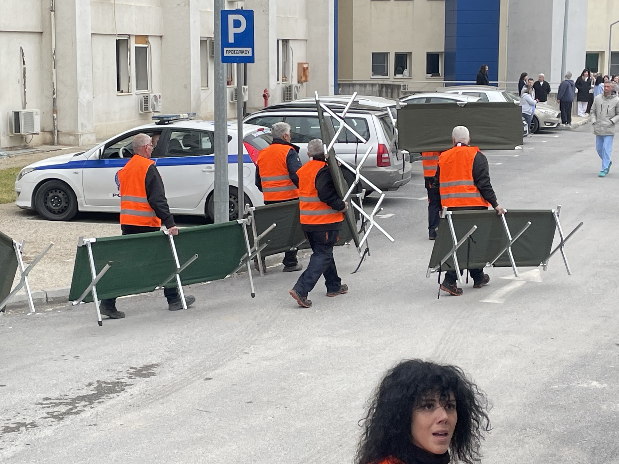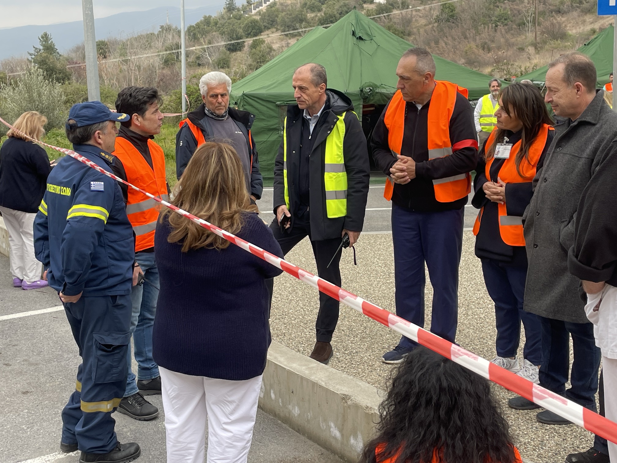 Παράλληλα, στον προαύλιο χώρο του νοσοκομείου αναπτύχθηκε προσωρινός σκηνικός καταυλισμός με μονάδες διαλογής (triage) και νοσηλείας, σύμφωνα με τα διεθνή πρότυπα διαχείρισης μαζικών καταστροφών. Εκεί πραγματοποιήθηκε η υποδοχή και κατηγοριοποίηση των περιστατικών με βάση τη βαρύτητά τους.