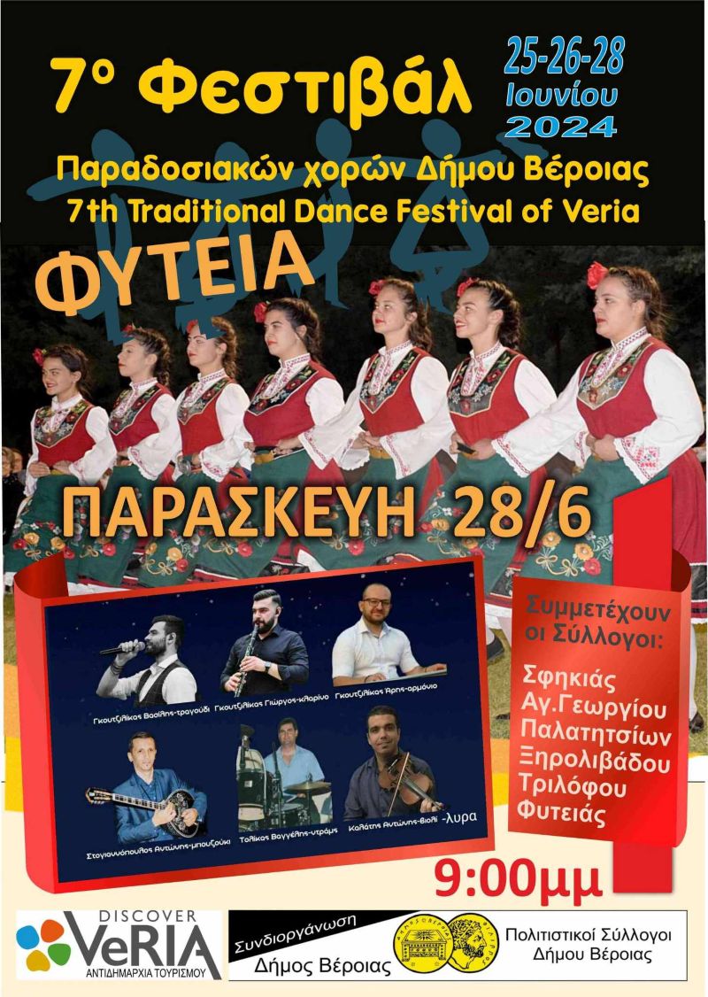 ● 21:00 μ.μ. ΛΗΞΗ ΦΕΣΤΙΒΑΛ Συμμετοχές: Λαογραφικός Σύλλογος Βλάχων Βέροιας, Μορφωτικός & Πολιτιστικός Σύλλογος Βεργίνας «ΑΙΓΕΣ», Μορφωτικός Σύλλογος «Η ΚΑΛΛΙΘΕΑ», Μορφωτικός Πολιτιστικός Σύλλογος Τριλόφου «Ο ΑΡΙΣΤΟΤΕΛΗΣ», Πολιτιστικός Όμιλος Ξηρολιβάδου, Εκπολιτιστικός Μορφωτικός Σύλλογος Φυτειάς και Πρόγραμμα με το «Πεντάγραμμο» και την ορχήστρα Γκουτζιλίκα.