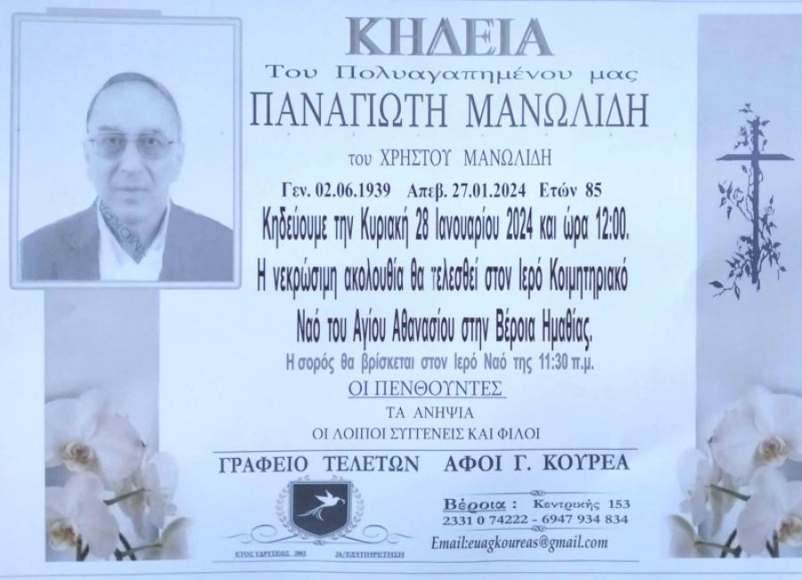 Κηδεύεται σήμερα Κυριακή 28 Ιανουαρίου 2024 και ώρα 12.00 το μεσημέρι, ο Παναγιώτης, Χρήστου, Μανωλίδης, 85 ετών. Η νεκρώσιμη ακολουθία θα τελεσθεί στον Ιερό Ναό Αγίου Αθανασίου (Κοιμητήρια) στη Βέροια.