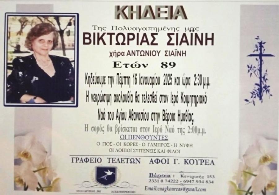 Κηδεύεται σήμερα Πέμπτη 16 Ιανουαρίου 2025 και ώρα 2.30 το μεσημέρι, η Βικτωρία, χήρα Αντωνίου, Σιαϊνη, 89 ετών. Η νεκρώσιμη ακολουθία θα τελεσθεί στον Ιερό Ναό Αγίου Αθανασίου (Κοιμητήρια) στη Βέροια.