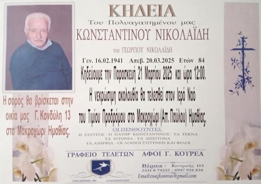 Κηδεύεται σήμερα Παρασκευή 21 Μαρτίου 2025 και ώρα 12.00 το μεσημέρι, ο Κωνσταντίνος, Γεωργίου, Νικολαϊδης, 84 ετών. Η νεκρώσιμη ακολουθία θα τελεσθεί στον Ιερό Ναό του Τιμίου Προδρόμου, στο Μακροχώρι Δήμου Βέροιας.