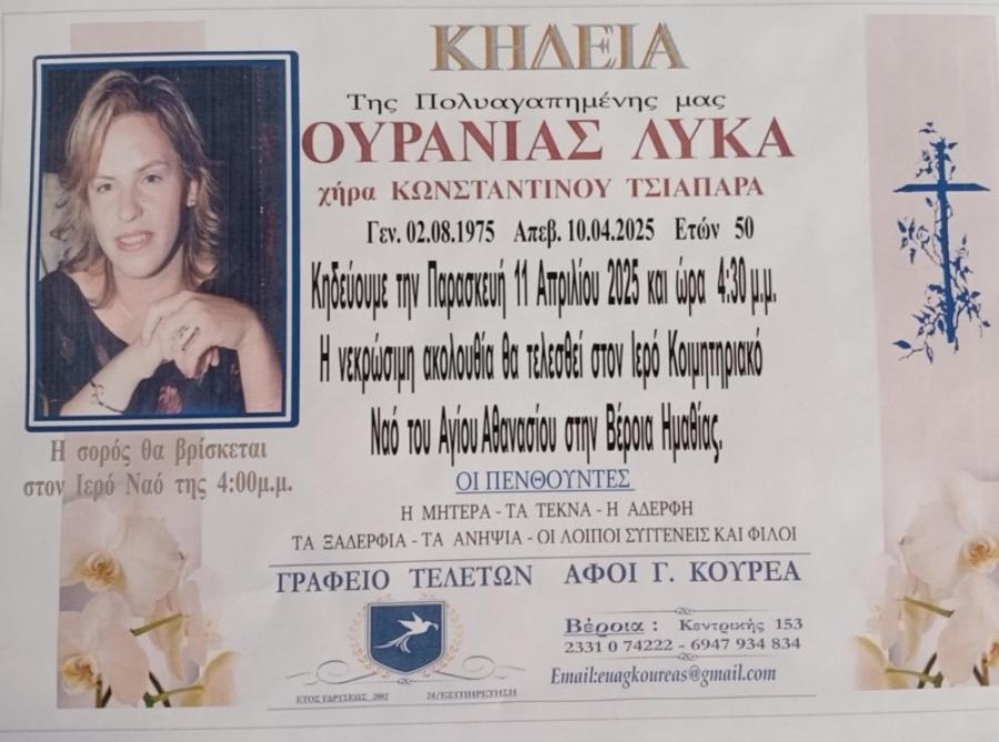 Κηδεύεται αύριο Παρασκευή 11 Απριλίου 2025 και ώρα 4.30 το απόγευμα, η Ουρανία Λύκα, χήρα Κωνσταντίνου Τσιαπάρα, 50 ετών. Η νεκρώσιμη ακολουθία θα τελεσθεί στον Ιερό Ναό του Αγίου Αθανασίου (Κοιμητήρια), στη Βέροια.