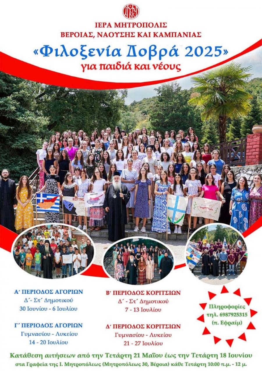 Για ακόμη μία χρονιά η Ιερά Μητρόπολις Βεροίας, Ναούσης και Καμπανίας θα πραγματοποιήσει κατά τον μήνα Ιούλιο, αντί κατασκήνωσης, το πρόγραμμα «Φιλοξενία Δοβρά» για παιδιά και νέους.