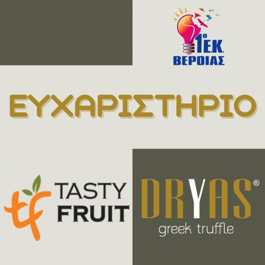 Με την παρούσα επιστολή επιθυμούμε να ευχαριστήσουμε την εταιρεία Tasty Fruit και τους υπευθύνους της, για την ευγενική και γενναιόδωρη προσφορά τους σε πρώτη ύλη, την οποία αξιοποιήσαμε άμεσα και με τον καλύτερο τρόπο για την υλοποίηση των εργαστηριακών ασκήσεων στα μαθήματα Αρχές Επεξεργασίας Τροφίμων και Τεχνολογίας Τροφίμων του Τομέα Γεωπονίας Τεχνολογίας τροφίμων, Διατροφής & Περιβάλλοντος. Θα θέλαμε επίσης να ευχαριστούμε και για την παραχώρηση του λεωφορείου της εταιρείας, για την μετακίνηση των μαθητών μας στις εγκαταστάσεις των επιχειρήσεων Tasty Fruit και DRYAS Greek truffle. Η ευγενική αυτή χορηγία εκφράζει κοινωνική ευαισθησία και ενδιαφέρον για τους μαθητές μας και αποτελεί παράδειγμα προς μίμηση.