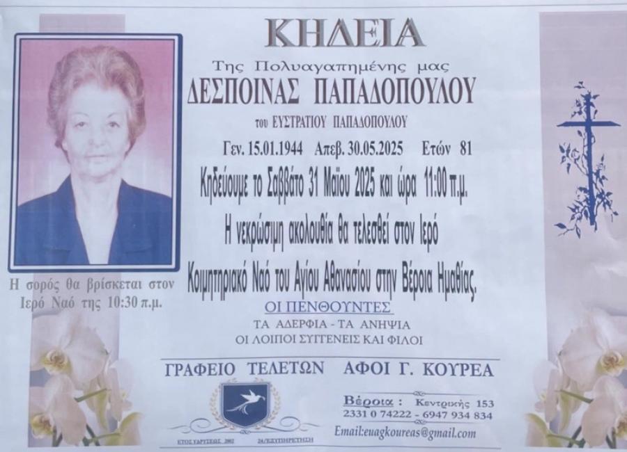 Κηδεύεται σήμερα Σάββατο 31 Μαΐου 2025 και ώρα 11.00 το πρωί, η Δέσποινα, Ευστρατίου, Παπαδοπούλου, 81 ετών. Η νεκρώσιμη ακολουθία θα τελεσθεί στον Ιερό Ναό του Αγίου Αθανασίου (Κοιμητήρια), στη Βέροια.