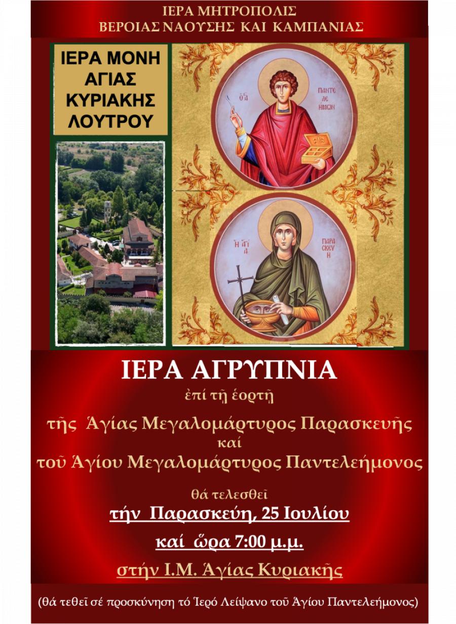 Ιερά Αγρυπνία θα τελεσθεί στην Ιερά Μονή Αγίας Κυριακής Λουτρού την Παρασκευή 25 Ιουλίου και ώρα 19:00, επί τη εορτή των Αγίων Μεγαλομαρτύρων Παντελεήμονος και Παρασκευής.