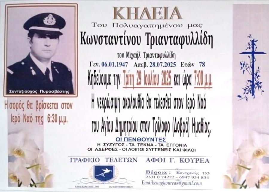 Κηδεύεται σήμερα Τρίτη 29 Ιουλίου 2025 και ώρα 7.00 το απόγευμα, ο Κωνσταντίνος, Μιχαήλ, Τριανταφυλλίδης, 78 ετών. Η νεκρώσιμη ακολουθία θα τελεσθεί στον Ιερό Ναό του Αγίου Δημητρίου, στον Τρίλοφο Δήμου Βέροιας.