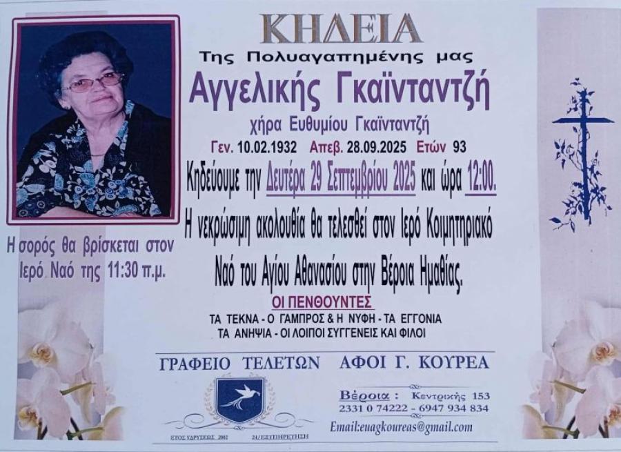 Κηδεύεται σήμερα Δευτέρα 29 Σεπτεμβρίου 2025 και ώρα 12.00 το μεσημέρι, η Αγγελική, χήρα Ευθυμίου, Γκαϊνταντζή, 93 ετών. Η νεκρώσιμη ακολουθία θα τελεσθεί στον Ιερό Ναό του Αγίου Αθανασίου (Κοιμητήρια) στη Βέροια.