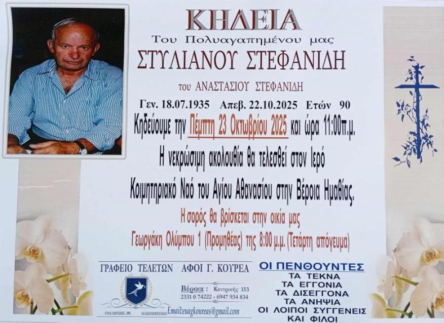 Κηδεύεται αύριο Πέμπτη 23 Οκτωβρίου 2025 και ώρα 11,00 το πρωί, ο Στυλιανός, Αναστασίου, Στεφανίδης, 90 ετών. Η νεκρώσιμη ακολουθία θα τελεσθεί στον Ιερό Ναό του Αγίου Αθανασίου (Κοιμητήρια), στη Βέροια.