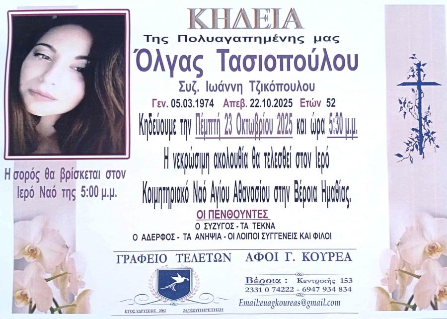 Κηδεύεται σήμερα Πέμπτη 23 Οκτωβρίου 2025 και ώρα 5,30 το απόγευμα, η Όλγα, σύζυγος Ιωάννη Τζικόπουλου, Τασιοπούλου, 52 ετών. Η νεκρώσιμη ακολουθία θα τελεσθεί στον Ιερό Ναό του Αγίου Αθανασίου (Κοιμητήρια), στη Βέροια.