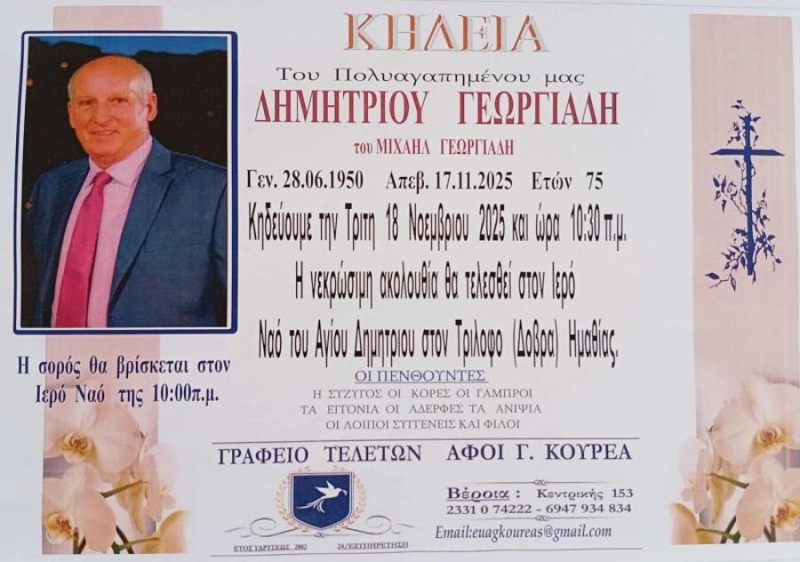 Κηδεύεται αύριο Τρίτη 18 Νοεμβρίου 2025 και ώρα 10,30 το πρωί, ο Δημήτριος, Μιχαήλ, Γεωργιάδης, 75 ετών. Η νεκρώσιμη ακολουθία θα τελεσθεί στον Ιερό Ναό του Αγίου Δημητρίου στον Τρίλοφο Δήμου Βέροιας.