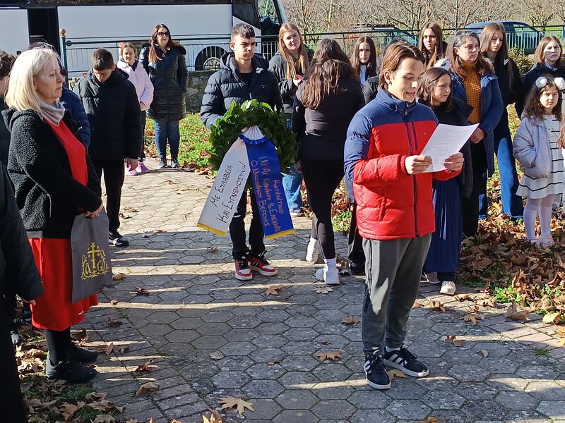Στο μνημείο, μαθητές μέλη του κατηχητικού, ανέγνωσαν το ιστορικό της δράσης του Καπετάν Άγρα και του Αντώνη Μίγκα και κατέθεσαν στεφάνι στο τσιμεντένιο ομοίωμα του δένδρου της Καρυδιάς, σε κλαδί της οποίας οι Βούλγαροι Κομιτατζήδες απαγχόνισαν τα δύο παλικάρια ύστερα από την ύπουλη σύλληψή τους.