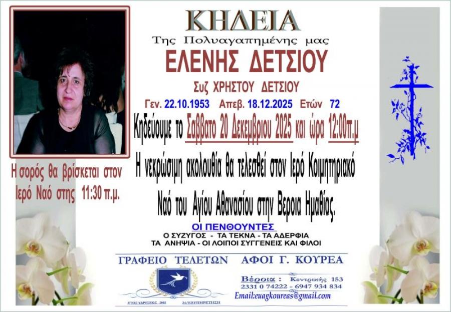 Κηδεύεται αύριο Σάββατο 20 Δεκεμβρίου 2025 και ώρα 12,00 το μεσημέρι, η Ελένη, συζ. Χρήστου, Δέτσιου, 72 ετών. Η νεκρώσιμη ακολουθία θα τελεσθεί στον Ιερό Ναό του Αγίου Αθανασίου (Κοιμητήρια) στη Βέροια.