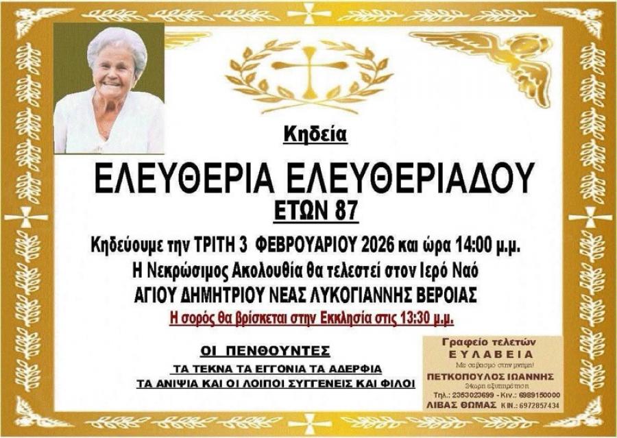 Κηδεύεται αύριο Τρίτη 3 Φεβρουαρίου 2026 και ώρα 14.00 το μεσημέρι, η Ελευθερία Ελευθεριάδου, 87 ετών. Η νεκρώσιμη ακολουθία θα τελεσθεί στον Ιερό Ναό των Αγίου Δημητρίου στη Νέα Λυκογιάννη Δήμου Βέροιας.