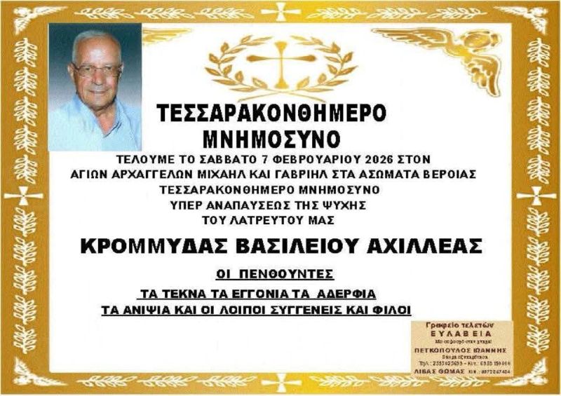 Το Σάββατο 7 Φεβρουαρίου 2026 θα τελεστεί το τεσσαρακονθήμερο μνημόσυνο στον Ιερό Ναό Αγίων Αρχαγγέλων Μιχαήλ και Γαβριήλ στα Ασώματα Βέροιας, για την ανάπαυση της ψυχής του αγαπημένου μας ΚΡΟΜΜΥΔΑ ΑΧΙΛΛΕΑ του Βασιλείου.