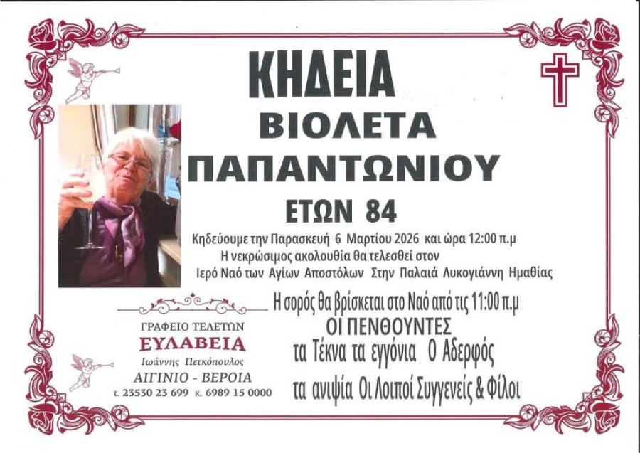 Κηδεύεται την Παρασκευή 6 Μαρτίου 2026 και ώρα 12.00 το μεσημέρι, η Βιολέτα Παπαντωνίου, 84 ετών. Η νεκρώσιμη ακολουθία θα τελεσθεί στον Ιερό Ναό Αγίων Αποστόλων στην Παλαιά Λυκογιάννη Ημαθίας. Η σορός θα βρίσκεται στον Ιερό Ναό ώρα 11.00 π.μ.