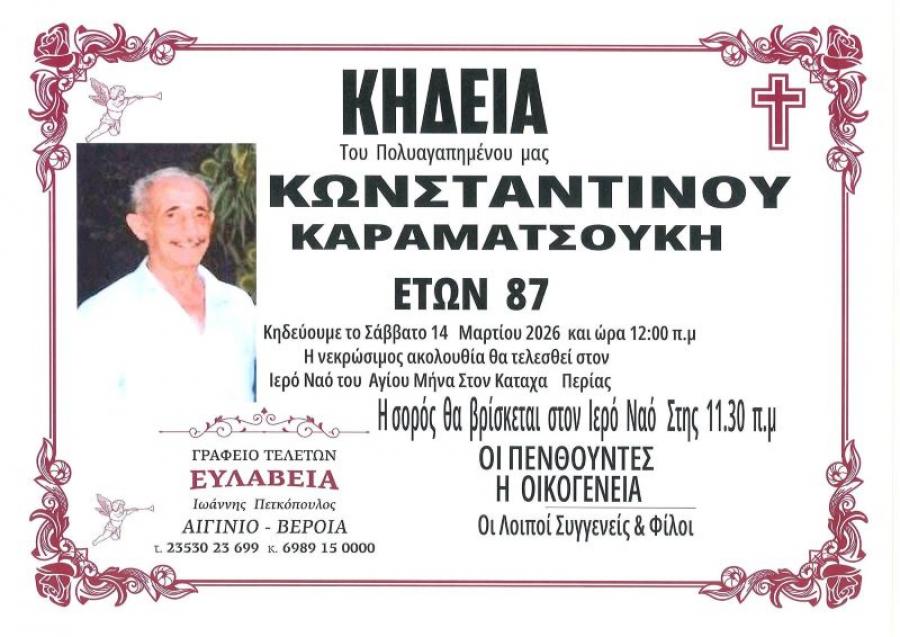 Κηδεύεται αύριο Σάββατο 14 Μαρτίου 2026 και ώρα 12.00 το μεσημέρι, ο Κωνσταντίνος Καραματσούκης, 87 ετών. Η νεκρώσιμη ακολουθία θα τελεσθεί στον Ιερό Ναό του Αγίου Μηνά σταν Καταχά Πιερίας. Η σορός θα βρίσκεται στον Ιερό Ναό στις 11.30 π.μ.