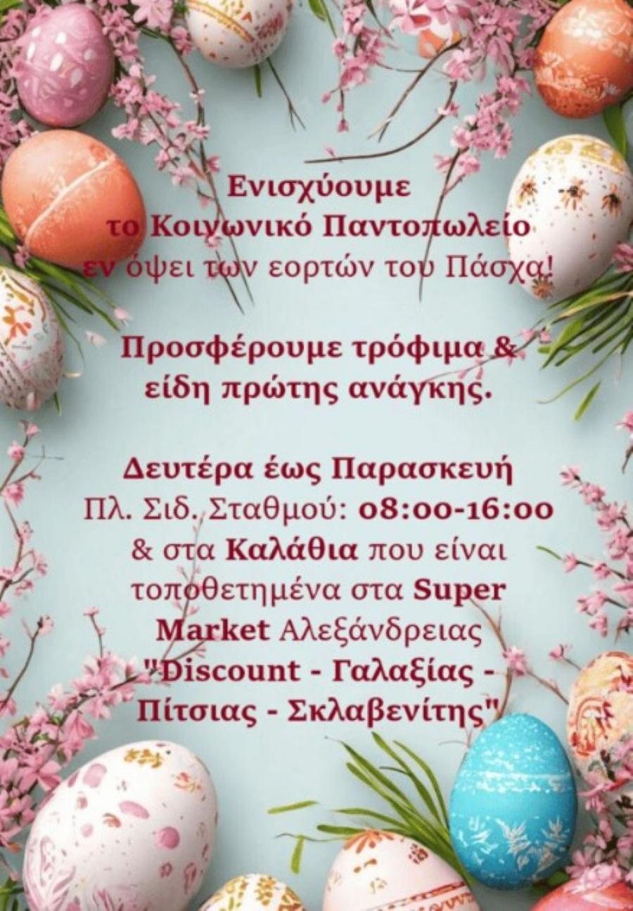 Η Αντιδήμαρχος και τα Στελέχη του Κοινωνικού Παντοπωλείου Διεύθυνσης Κοινωνικής Προστασίας, Παιδείας και Πολιτισμού του Δήμου Αλεξάνδρειας, εν όψει των εορτών του Πάσχα απευθύνουν πρόσκληση σε ιδιώτες, επιχειρήσεις, συλλόγους και τοπικούς φορείς να ενισχύσουν το έργο της Δομής προσφέροντας τρόφιμα μακράς διαρκείας, είδη προσωπικής περιποίησης και υγιεινής και οποιαδήποτε άλλα είδη πρώτης ανάγκης επιθυμούν.