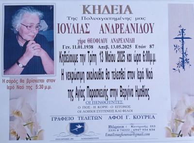 Κηδεύεται σήμερα Τετάρτη 10 Δεκεμβρίου 2025 και ώρα 12,00 το μεσημέρι, η Αρετή, χήρα Νικολάου, Τσιαρτσή, 90 ετών. Η νεκρώσιμη ακολουθία θα τελεσθεί στον Ιερό Ναό του Προφήτη Ηλία στο Ταγαροχώρι Δήμου Βέροιας. Η σορός θα βρίσκεται στον Ιερό Ναό ώρα 11,00 π.μ.
