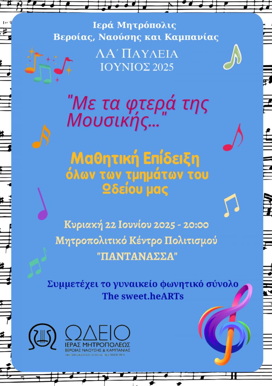 Το Ωδείο της Ιεράς Μητροπόλεως Βεροίας, Ναούσης και Καμπανίας στο πλαίσιο των ΛΑ΄ΠΑΥΛΕΙΩΝ διοργανώνει Μαθητική Επίδειξη όλων των τμημάτων του με τίτλο: «Με τα φτερά της Μουσικής». Η εκδήλωση θα πραγματοποιηθεί την Κυριακή 22 Ιουνίου 2025 και ώρα 20:00 στο Μητροπολιτικό Κέντρο Πολιτισμού «ΠΑΝΤΑΝΑΣΣΑ».