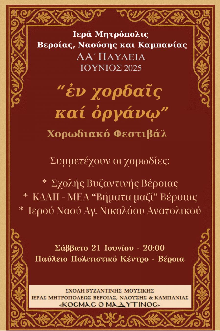 Η Σχολή Βυζαντινής Μουσικής της Ιεράς Μητροπόλεως Βεροίας, Ναούσης και Καμπανίας «Κοσμάς ο Μαδυτινός» στο πλαίσιο των ΛΑ΄ΠΑΥΛΕΙΩΝ και τιμώντας την Παγκόσμια Ημέρα Μουσικής, διοργανώνει Χορωδιακό Φεστιβάλ με τίτλο: «Εν χορδαίς και οργάνω», το Σάββατο 21 Ιουνίου 2025 και ώρα 8:00 μ.μ. στο Παύλειο Πολιτιστικό Κέντρο στη Βέροια.