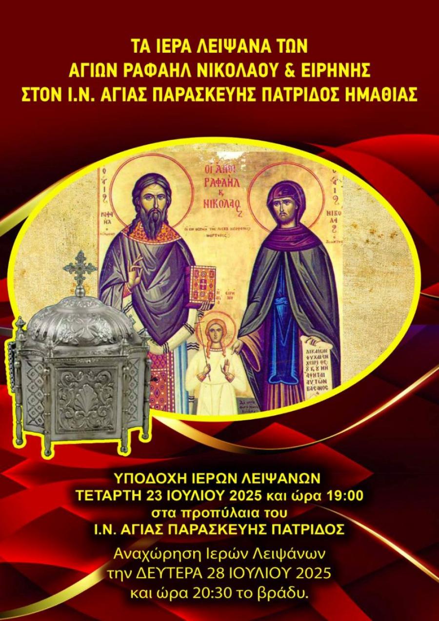 Τα ιερά λείψανα των νεοφανών αγίων Ραφαήλ, Νικολάου και Ειρήνης στον πανηγυρίζοντα ιερό ναό Αγίας Παρασκευής στην Πατρίδα Ημαθίας.