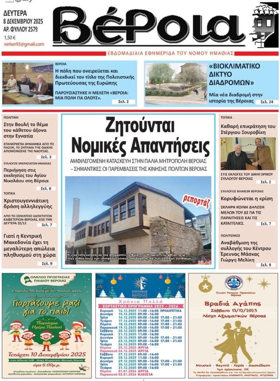 Διαβάστε σήμερα Δευτέρα στην εφημερίδα "Βέροια"