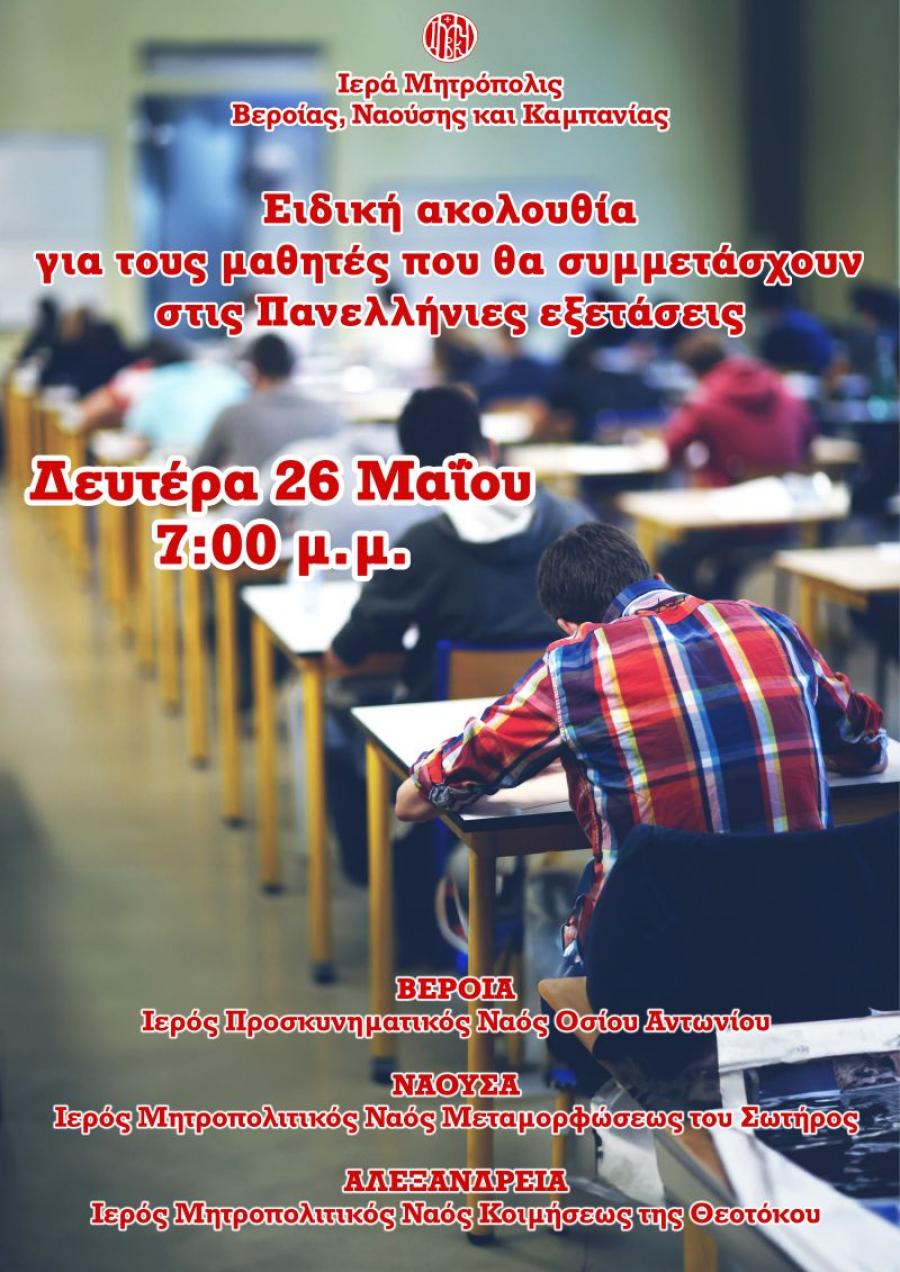 Σήμερα Δευτέρα 26 Μαΐου στις 7:00 μ.μ.. θα τελεστεί η ειδική ακολουθία για τους μαθητές που θα συμμετάσχουν στις Πανελλήνιες εξετάσεις. Στη Βέροια θα τελεστεί Αρχιερατική Θεία Λειτουργία προεξάρχοντος του Σεβασμιωτάτου Μητροπολίτου μας κ. Παντελεήμονος στον Ιερό Προσκυνηματικό Ναό του Οσίου Αντωνίου, στη Νάουσα θα τελεστεί Παράκληση στον Μητροπολιτικό Ιερό Ναό Μεταμορφώσεως του Σωτήρος και στην Αλεξάνδρεια θα τελεστεί Θεία Λειτουργία στον Μητροπολιτικό Ιερό Ναό Κοιμήσεως της Θεοτόκου.