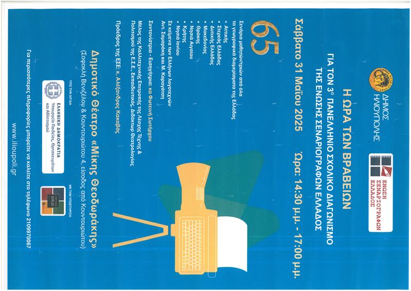 Το Σάββατο, 31 Μαΐου, στο κατάμεστο από μαθητές, εκπαιδευτικούς και γονείς από όλα τα μέρη της Ελλάδος αμφιθέατρο του Δήμου Ηλιούπολης έλαβε χώρα η τελετή βράβευσης των διακριθέντων στον 3ο Πανελλήνιο Διαγωνισμό Συγγραφής Σεναρίου εκ Διασκευής Ελληνικού Διηγήματος της Ένωσης Σεναριογράφων Ελλάδος με την υποστήριξη της Λέσχης Τέχνης και Πολιτισμού της Ε.Σ.Ε. και του Ινστιτούτου Εκπαιδευτικής Πολιτικής.