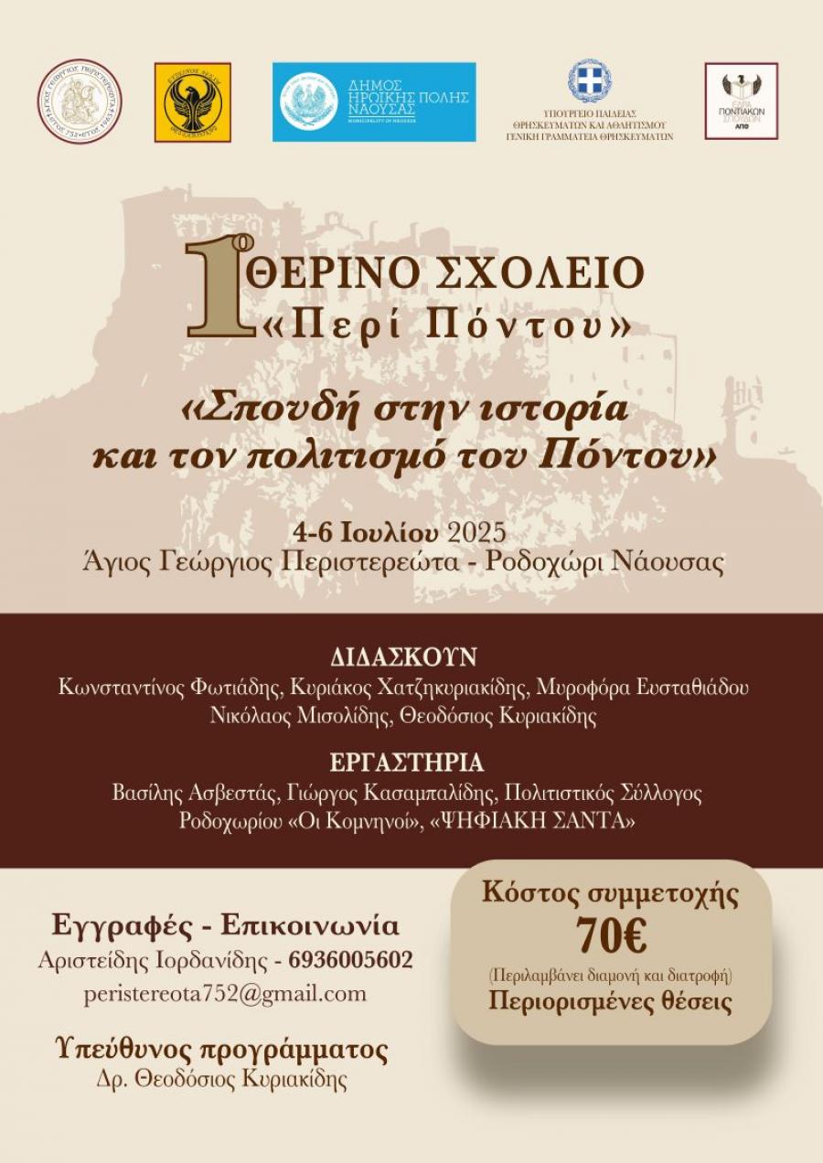Το Σωματείο Άγιος Γεώργιος Περιστερεώτα διοργανώνει το 1ο ΘΕΡΙΝΟ ΣΧΟΛΕΙΟ με τίτλο «Σπουδή στην ιστορία και τον πολιτισμό του Πόντου» στις 4-6 Ιουλίου 2025 στις εγκαταστάσεις του Σωματείου στο Ροδοχώρι της Νάουσας. Διδάσκουν καταξιωμένοι ακαδημαϊκοί και καθηγητές. Το Θερινό Σχολείο συνδιοργανώνουν και υποστηρίζουν η Γενική Γραμματεία Θρησκευμάτων του Υπουργείου Παιδείας, Θρησκευμάτων και Αθλητισμού της Ελλάδας, ο Δήμος Ηρωικής Πόλης Νάουσας, η Εύξεινος Λέσχη Θεσσαλονίκης και η Έδρα Ποντιακών Σπουδών του Αριστοτελείου Πανεπιστημίου Θεσσαλονίκης.