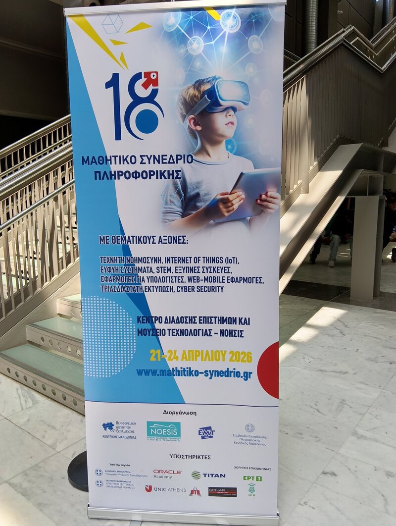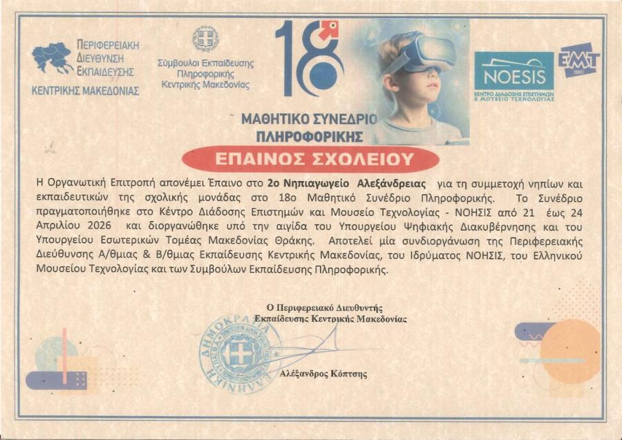Με ιδιαίτερη χαρά ανακοινώνουμε ότι το 2ο Νηπιαγωγείο Αλεξάνδρειας απέσπασε Έπαινο Σχολείου, καθώς και επαίνους για τις μαθήτριες, τους μαθητές και τις εκπαιδευτικούς του, στο 18ο Μαθητικό Συνέδριο Πληροφορικής, το οποίο πραγματοποιήθηκε από τις 21 έως τις 24 Απριλίου 2026 στο Κέντρο Διάδοσης Επιστημών και Μουσείο Τεχνολογίας ΝΟΗΣΙΣ.