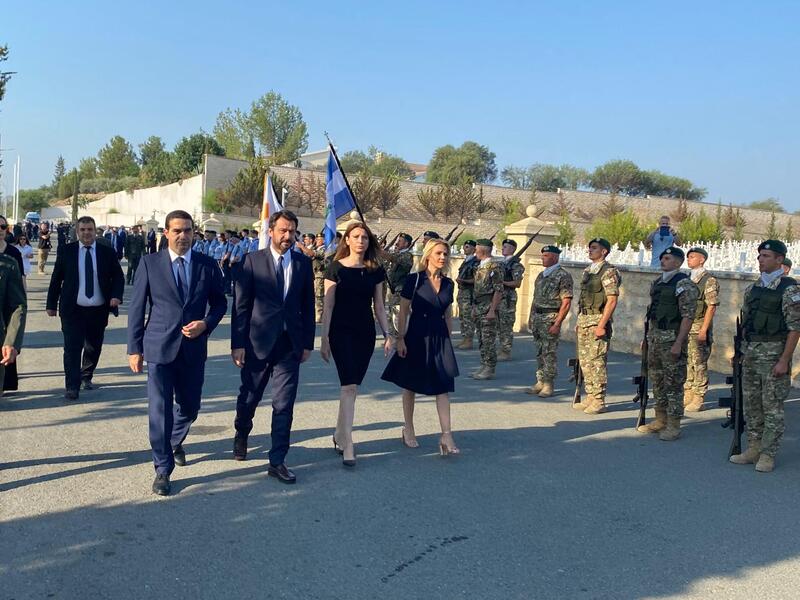 Την Κυριακή, ανήμερα της μαύρης επετείου της εισβολής, συμμετείχε στην επιμνημόσυνη δέηση στον Τύμβο της Μακεδονίτισσας και στο μνημόσυνο των πεσόντων στον Καθεδρικό Ναό του Αποστόλου Βαρνάβα, αποτίοντας φόρο τιμής στους ήρωες της ελευθερίας Η ελληνική αντιπροσωπεία έγινε δεκτή από τον Μακαριώτατο Αρχιεπίσκοπο Κύπρου και Νέας Ιουστινιανής, Γεώργιο, σε μια συνάντηση με έντονο συμβολισμό και εγκάρδιο κλίμα. Ενώ, το απόγευμα, παραβρέθηκε στην επίσημη εκδήλωση για τις μαύρες επετείους του πραξικοπήματος και της τουρκικής εισβολής στο Προεδρικό Μέγαρο της Κυπριακής Δημοκρατίας, όπου επιβεβαιώθηκε η κοινή στάση Αθήνας και Λευκωσίας απέναντι σε κάθε αποσχιστική πρακτική που αντιβαίνει στο Διεθνές Δίκαιο.
