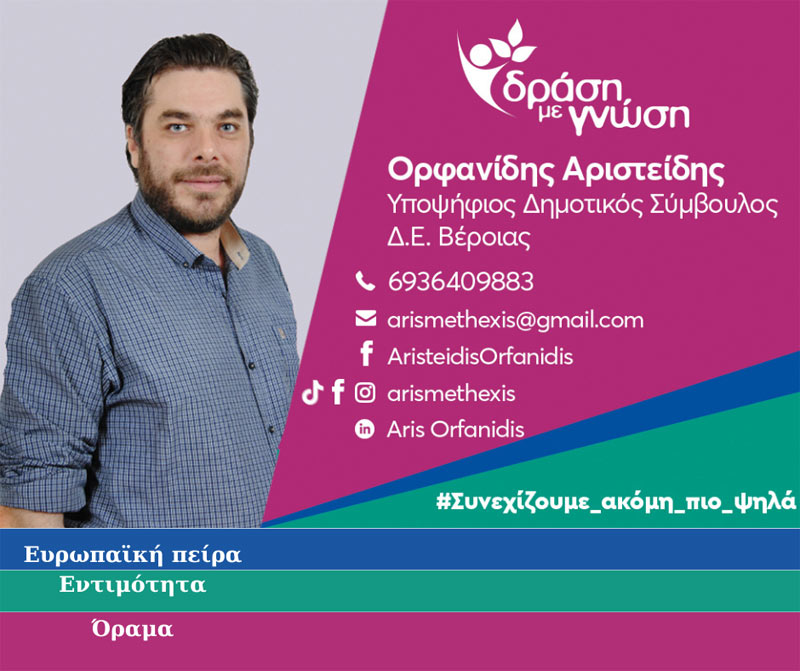 Ο Πρόεδρος του Ομίλου Φίλων Θεάτρου & Τεχνών Βέροιας και Υπεύθυνος Επικοινωνίας & Δημοσίων Σχέσεων, φιλόλογος-γλωσσολόγος Άρης (Αριστείδης) Ορφανίδης καλωσορίζεται στον συνδυασμό του δημάρχου για τις επικείμενες εκλογές του Οκτωβρίου.
