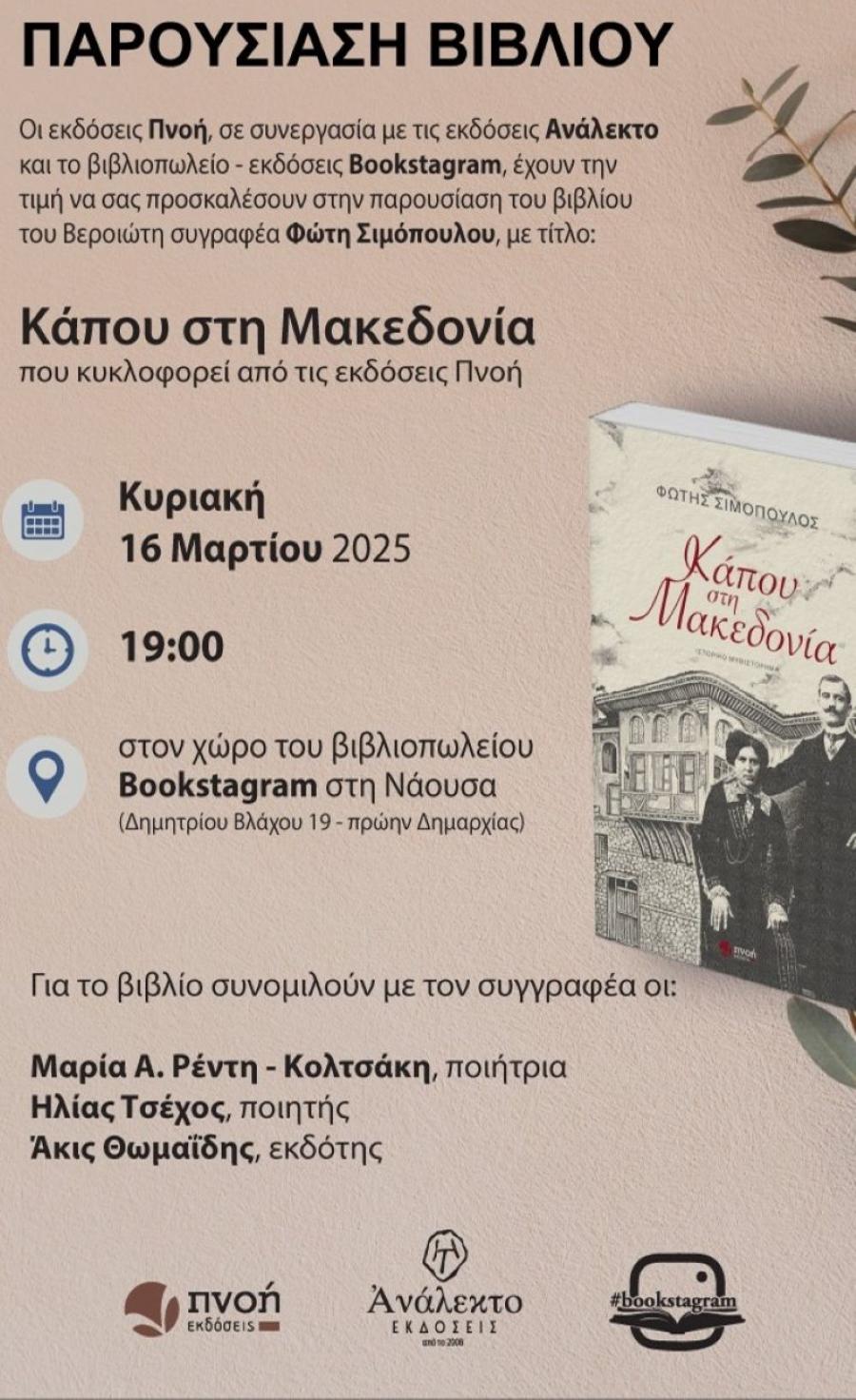 Πρώτος προσκεκλημένος ο Βεροιώτης συγγραφέας Φώτης Σιμόπουλος (Fotis Simopoulos) με το βιβλίο του ''Κάπου στη Μακεδονία'', που κυκλοφόρησε το 2021 από τις εκδόσεις Πνοή. Η παρουσίαση θα γίνει Κυριακή 16 Μαρτίου 2025, 7 απογεύματος στο βιβλιοπωλείο Bookstagram Store (Δημητρίου Βλάχου - πρώην Δημαρχίας - 19) στη Νάουσα.
