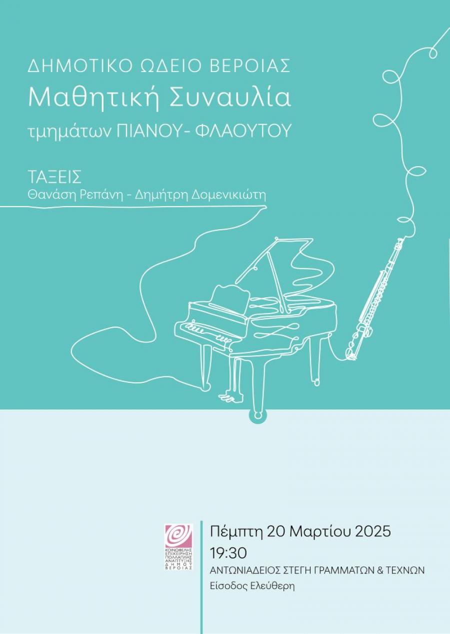 Μαθητική συναυλία πιάνου και φλάουτου θα πραγματοποιηθεί την Πέμπτη 20 Μαρτίου στην Αντωνιάδειο Στέγη Γραμμάτων και Τεχνών, στις 7.30 μ.μ.