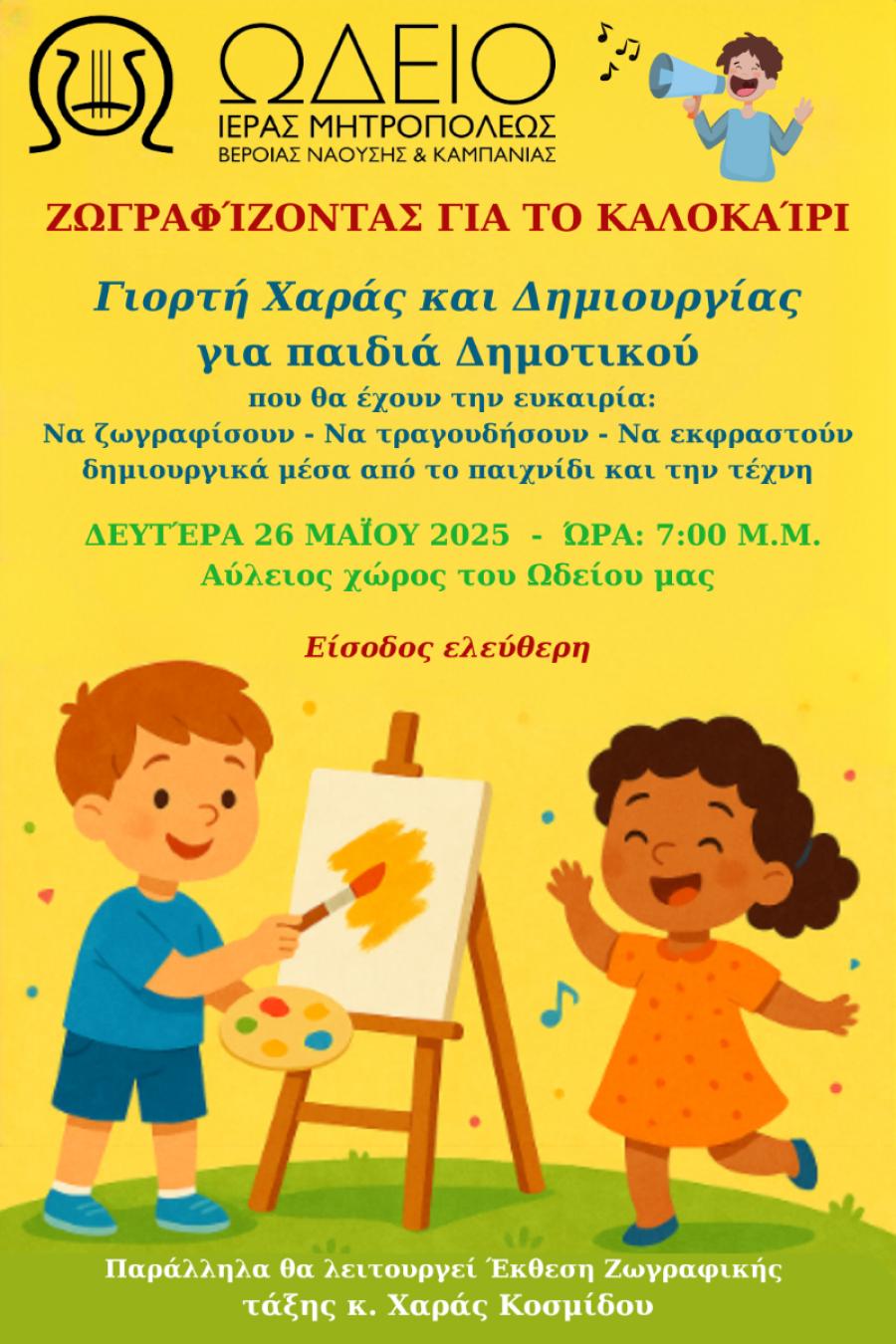 Το Ωδείο της Ιεράς Μητροπόλεως Βεροίας, Ναούσης και Καμπανίας, στο πλαίσιο των ΛΑ΄ ΠΑΥΛΕΙΩΝ και με αφορμή τη λήξη των μαθημάτων του Παιδικού Εργαστηρίου Ζωγραφικής, διοργανώνει μια γιορτινή εκδήλωση χαράς και δημιουργίας για όλα τα παιδιά Δημοτικού της πόλης μας.