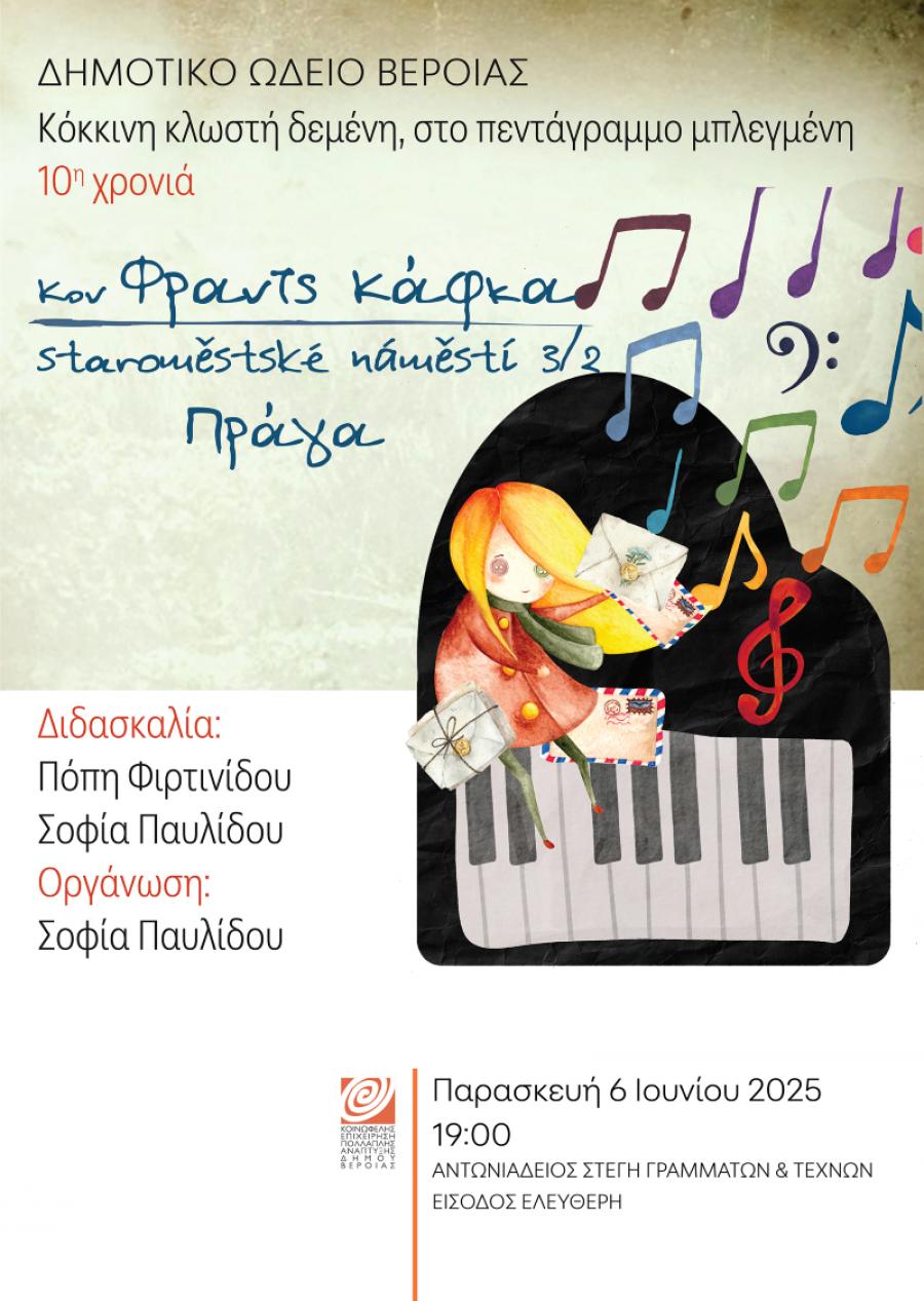 Στο πλαίσιο του μαθητικού πιανιστικού θεσμού «κόκκινη κλωστή δεμένη, στο πεντάγραμμο μπλεγμένη», του Δημοτικού Ωδείου της ΚΕΠΑ Δ. Βέροιας, οι μικροί μαθητές των τμημάτων πιάνου της Σοφίας Παυλίδου και της Πόπης Φιρτινίδου, παρουσιάζουν την Κούκλα του Φραντς Κάφκα, το μόνο παραμύθι που έγραψε ο σπουδαίος λογοτέχνης του 20ού αιώνα. Ένα κοριτσάκι ήταν πολύ λυπημένο γιατί είχε χαθεί η κούκλα της και ο μεγάλος Τσέχος συγγραφέας προσπάθησε να την παρηγορήσει λέγοντάς της πως το αγαπημένο της παιχνίδι δεν ήταν χαμένο, απλώς ταξίδευε για να γνωρίσει όλο τον κόσμο και την μεγάλη, την υπέροχη ζωή!