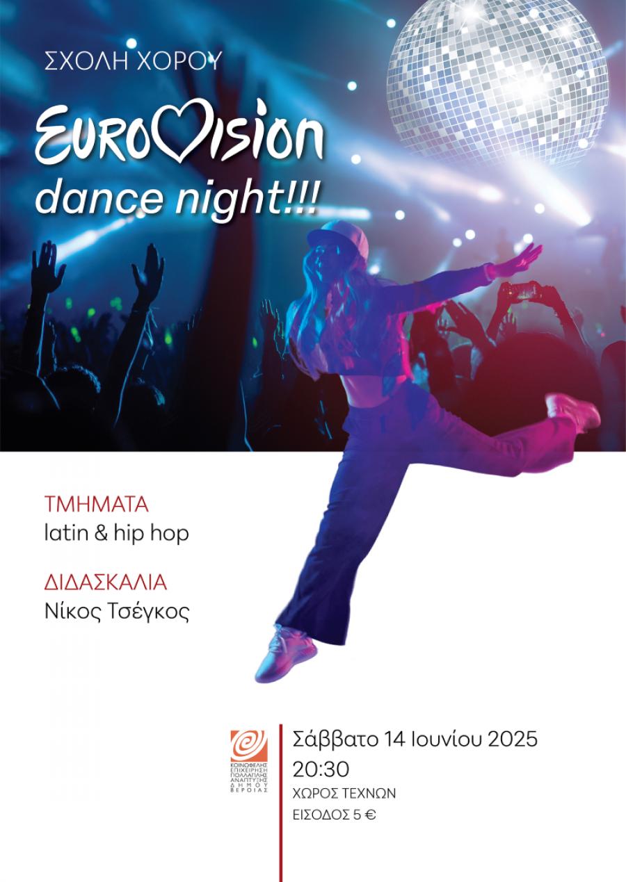 Τα τμήματα Latin και Hip Hop της σχολής χορού της ΚΕΠΑ Δήμου Βέροιας, παρουσιάζουν τη παράσταση “Eurovision dance night», το Σάββατο 14 Ιουνίου2025, στον Χώρο Τεχνών, στις 8.30 μ.μ.