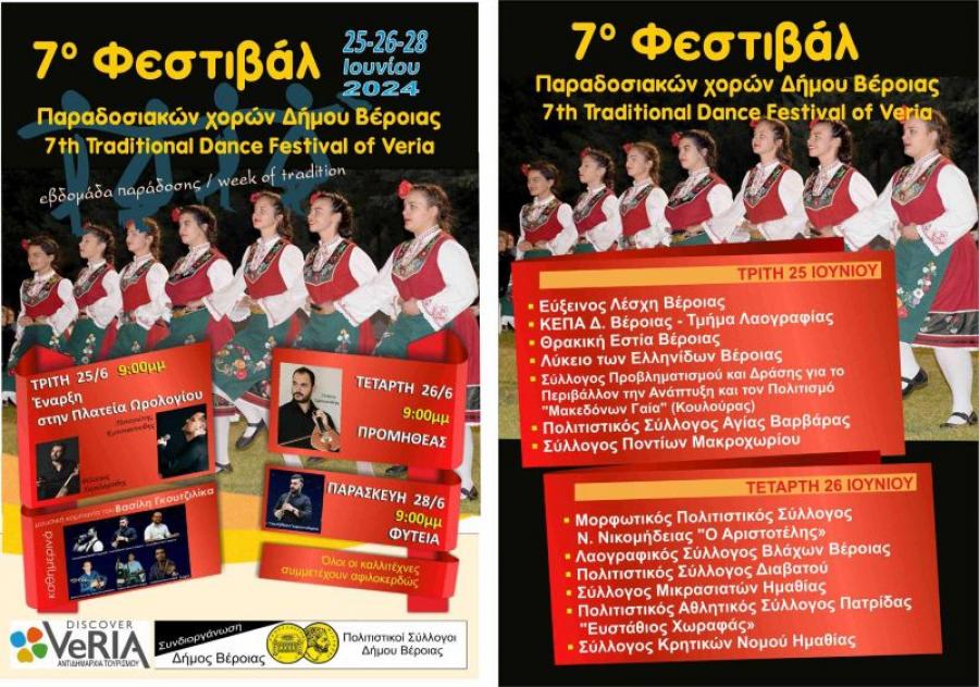 Με συμμετοχές από Πολιτιστικούς Συλλόγους της Βέροιας και των Δημοτικών Διαμερισμάτων, ξεκινά στις 9 Ιουλίου 2025 το 7ο Φεστιβάλ Παραδοσιακών Χορών του Δήμου Βέροιας, το οποίο θα πραγματοποιηθεί για τρεις ημέρες, στις 9, 10 και11 Ιουλίου 2025.