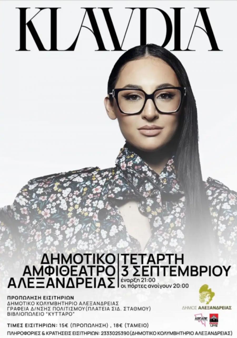 Ο Δήμος Αλεξάνδρειας με χαρά ανακοινώνει την έναρξη της προπώλησης εισιτηρίων για τη μεγάλη συναυλία της Κλαυδίας, που θα πραγματοποιηθεί την Τετάρτη 03 Σεπτεμβρίου 2025, στις 21:00, στο Δημοτικό Αμφιθέατρο Αλεξάνδρειας, στο πλαίσιο των πολιτιστικών εκδηλώσεων “ΑΛΕΞΑΝΔΡΕΙΑ 2025”.