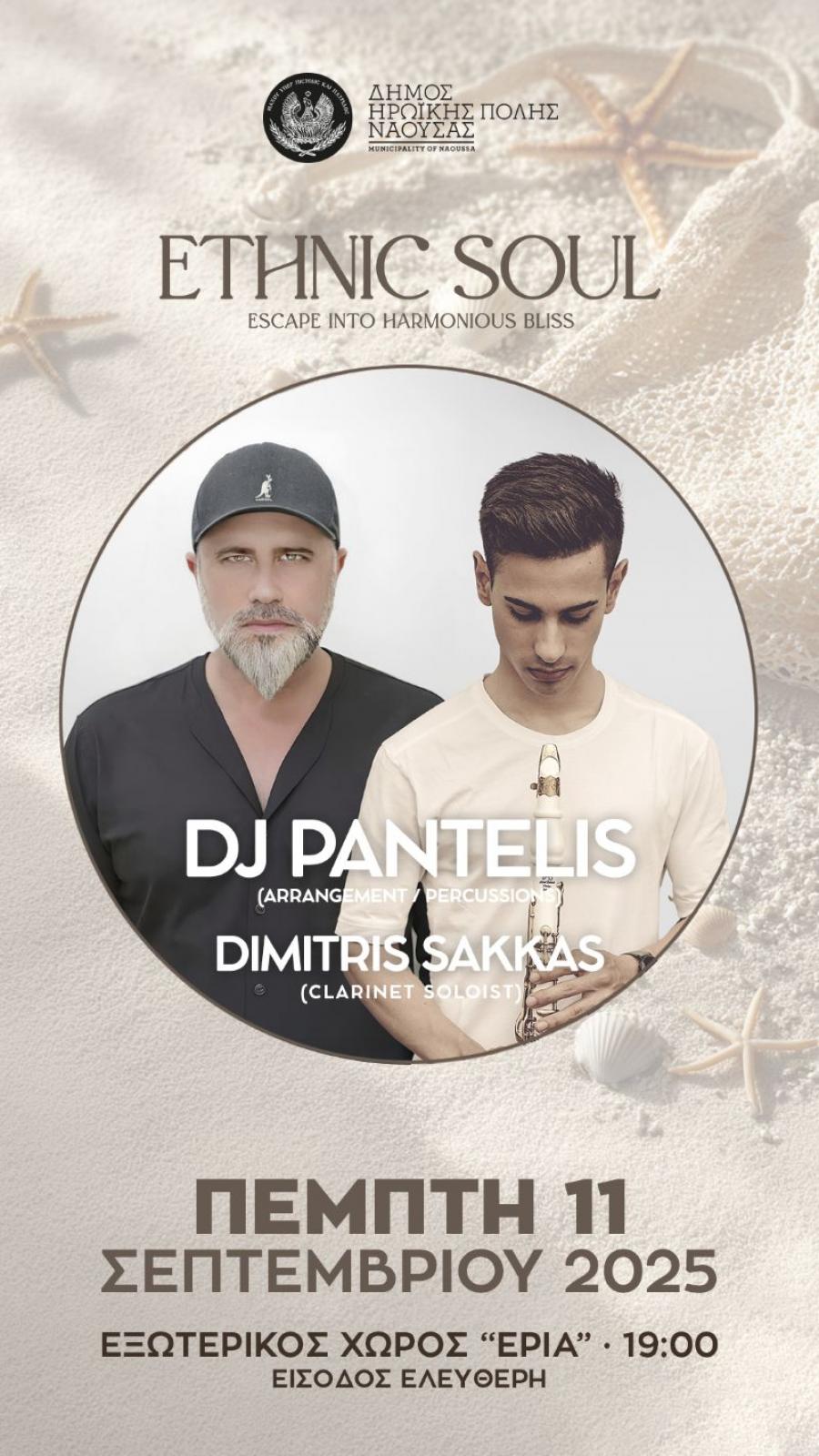 Ενόψει της έναρξης της νέας σχολικής περιόδου, μαθητές, μαθήτριες και το κοινό θα απολαύσουν τους "Ethnic Soul Project" την Πέμπτη 11 Σεπτεμβρίου και ώρα 18:30 στον εξωτερικό χ΄ρο του κτιρίου "ΕΡΙΑ" σε μία μοναδική live performance από τους DJ Pantelis και τον Dimitri Sakka (Clarinet/Ney), σε Ethnic,Organic και spiritual ήχους σε συνδυασμό με modern,electronic beats δημιουργούν το τέλειο soundtrack.