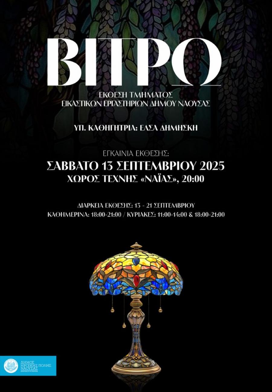 Η εναρκτήρια έκθεση είναι του τμήματος Βιτρώ με υπεύθυνη διδασκαλίας την κ. Έλσα Δημησκή, της οποίας τα εγκαίνια θα γίνουν την Κυριακή 13 Σεπτεμβρίου 2025 και ώρα 20:00 στον Χώρο Τέχνης «Ναϊάς».