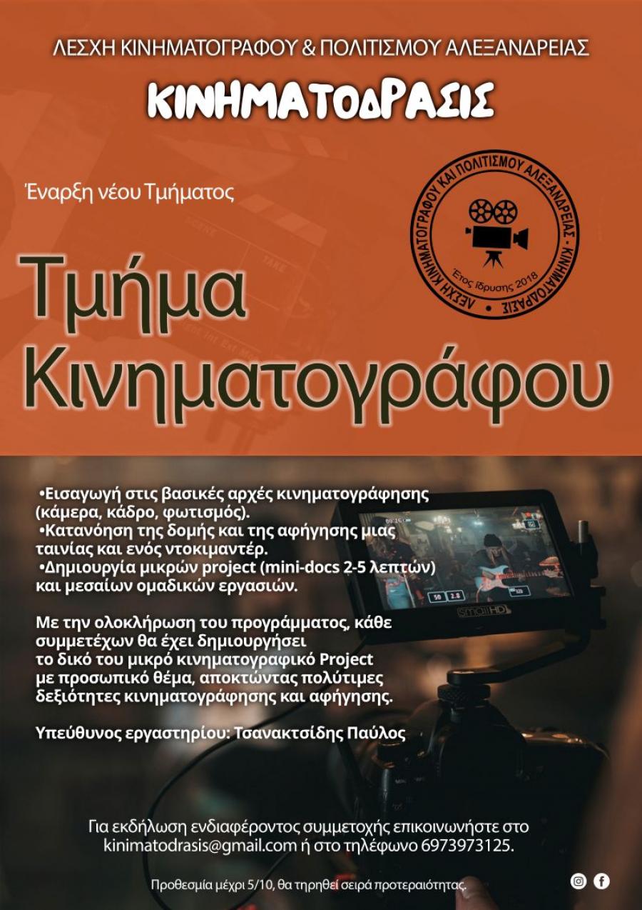 Η Λέσχη Κινηματόδρασις Αλεξάνδρειας ανακοινώνει με χαρά τη δημιουργία ενός νέου Τμήματος Κινηματογράφου, που θα λειτουργήσει από τον Οκτώβριο 2025 έως τον Μάιο 2026.